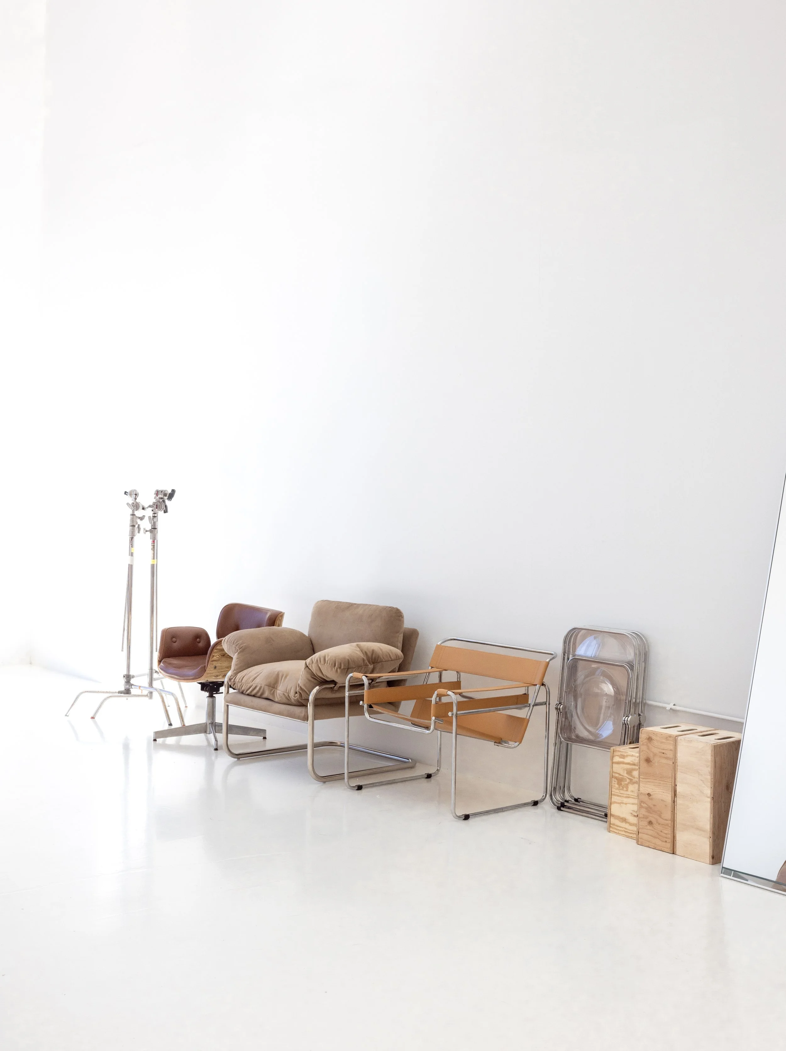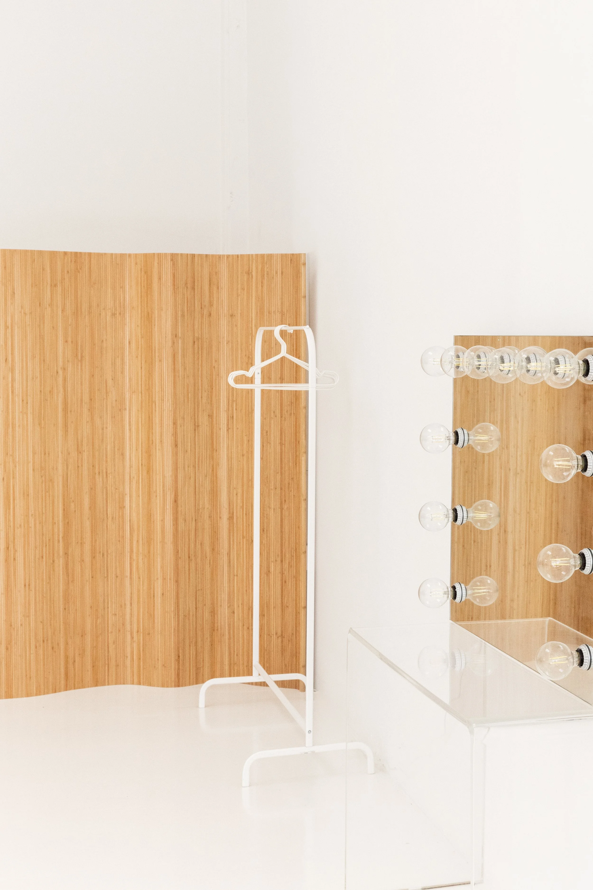 Renting the full studio provides exclusive access to the cyclorama and hangout space, complete with hair, makeup, and wardrobe areas, plus a private changing room. The space includes rolling tables, stools, wardrobe racks, a steamer, a private restroom, Wi-Fi, climate control, two dedicated parking spots, and optional in-house equipment rentals. This fully private, light-filled environment is designed for seamless, professional shoots that let your creative vision take center stage.